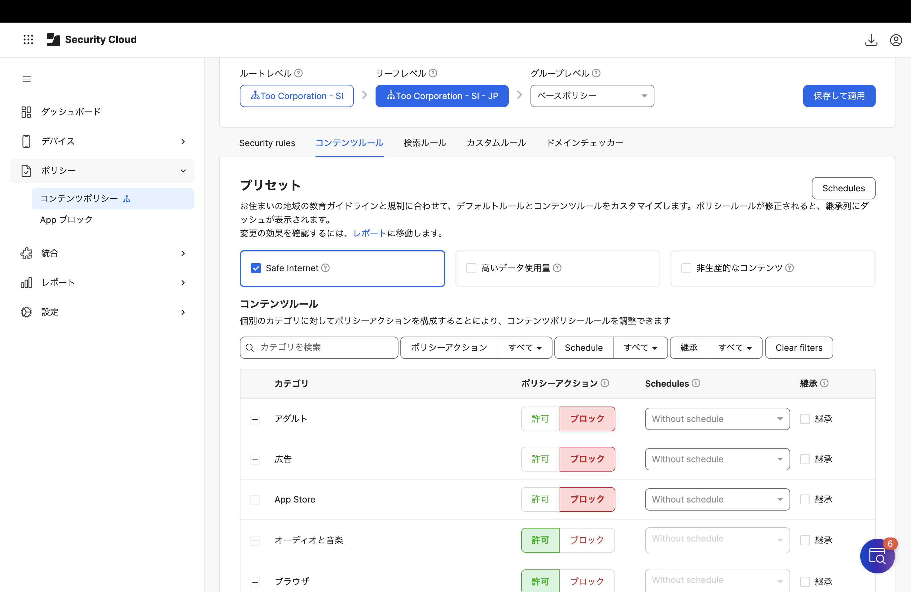 150を超える豊富なカテゴリから、 柔軟なグループごとの利用ルールを作成できます。Wi-Fi通信では許可するが、セルラー通信では制限するなど、通信種別ごとにルールを定めることも可能です。