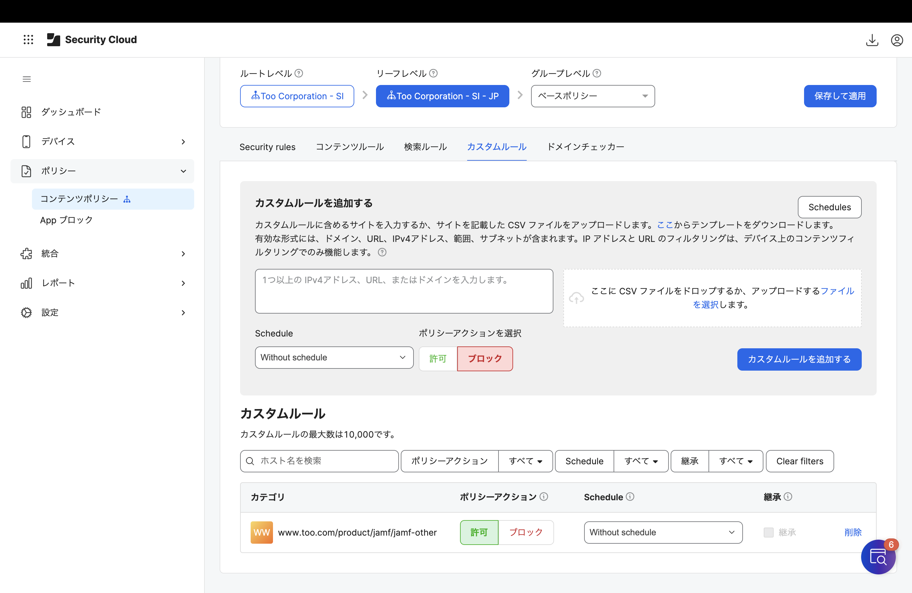 許可したカテゴリ内で特定のドメインをブロックしたり、ブロックしたカテゴリ内で特定のドメインを許可したりと独自のフィルタリングルールを作成できます。