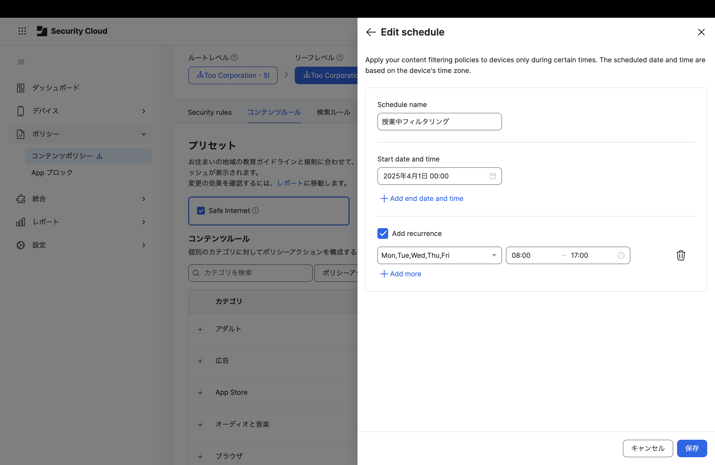 生徒の自主性を尊重して、放課後や休日は制限をかけたくない場合は、特定の曜日・時間帯だけデバイスに制限をかけることができます。