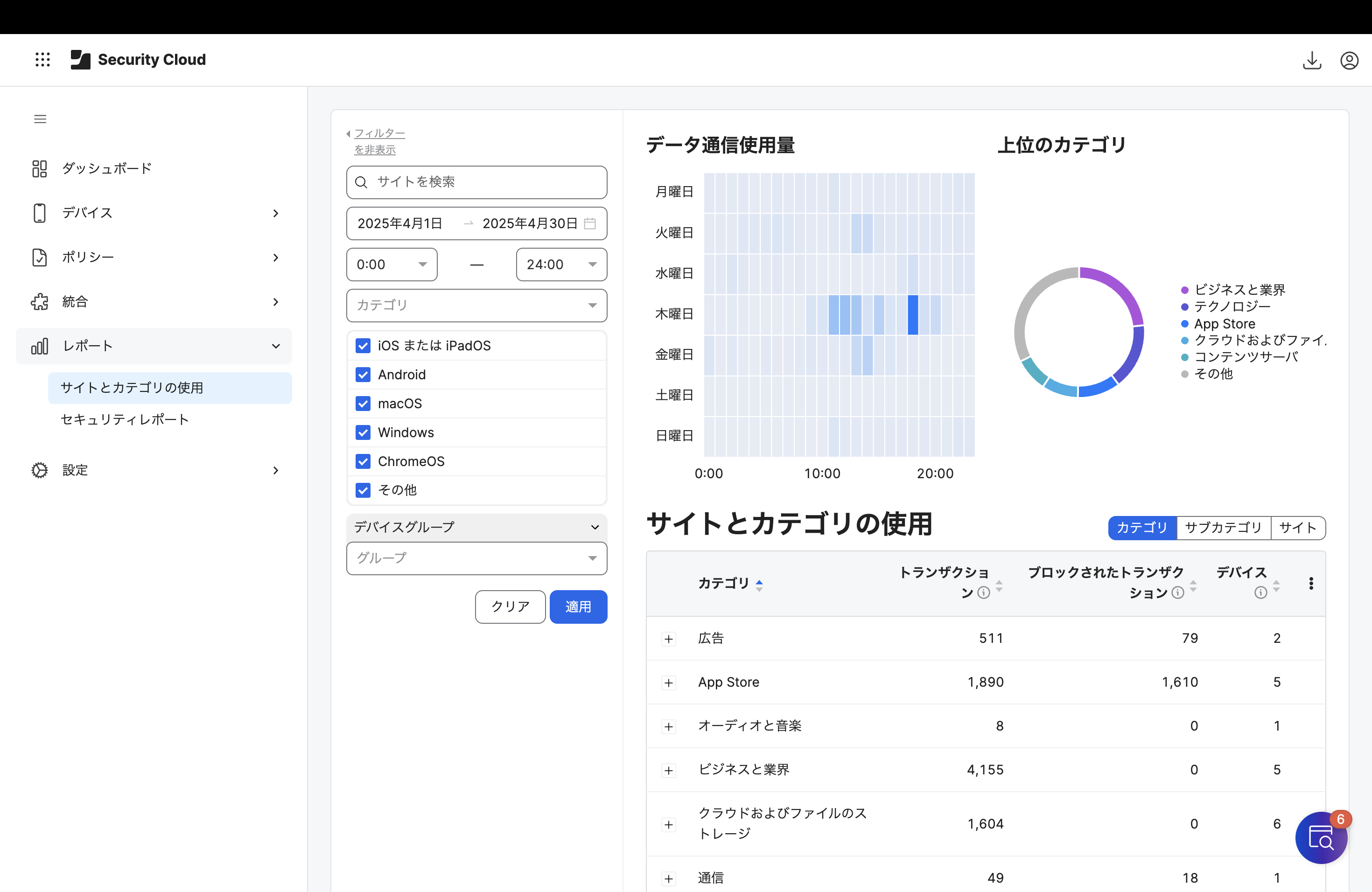 誰がどのデバイスでどこにアクセスしたか。通信方法ごとに、どのサイトやアプリでどれくらいのデータ通信量が発生しているかを管理者にリアルタイム表示します。