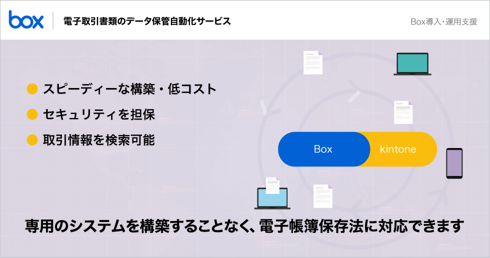 セキュリティに定評のあるクラウドストレージ「Box」と、キントーンを組み合わせたサービスです。改正電帳法に対応した電子取引情報の管理体制構築をお手伝いいたします。これから取引書類(帳簿)の電帳法に対応したい方、すでにご利用のBoxをさらに活用したい方に最適なサービスです。