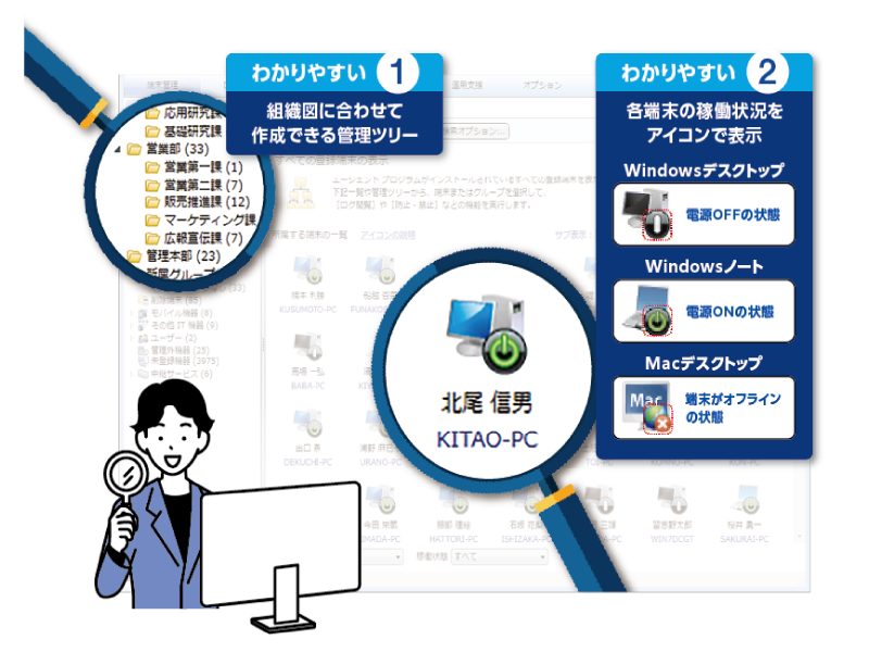 組織の2大クライアント端末であるWindowsとMacのPC操作監視およびIT資産管理に対応しています。各種操作ログの収集、操作制限、インベントリ収集、ライセンス管理などが可能です。