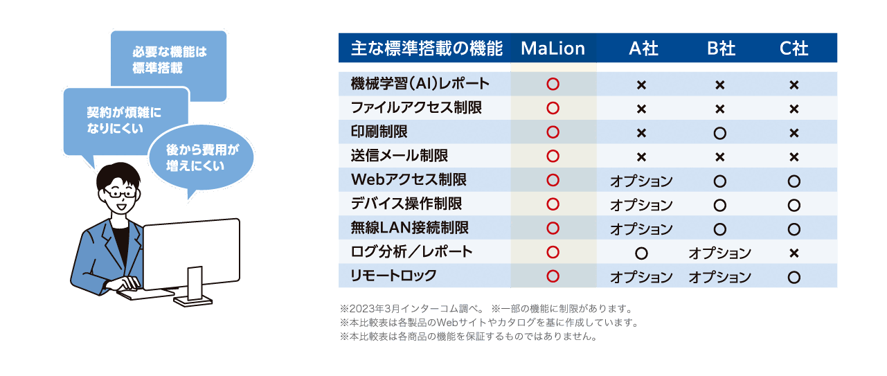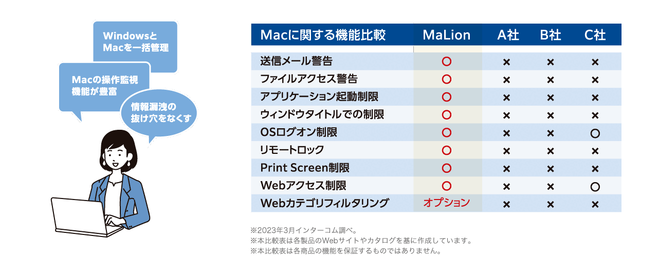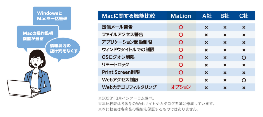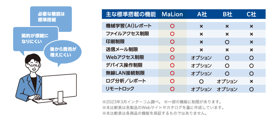 MaLionCloudは情報漏洩対策やIT資産管理を総合的に支援するWindows・Mac端末に対応したソフトウェアです。