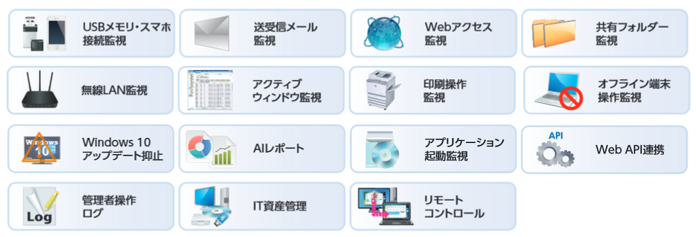 他社サービスで未対応の機能も搭載し社内外PCの総合的な運用管理に必要とされる機能一式を標準搭載しています。