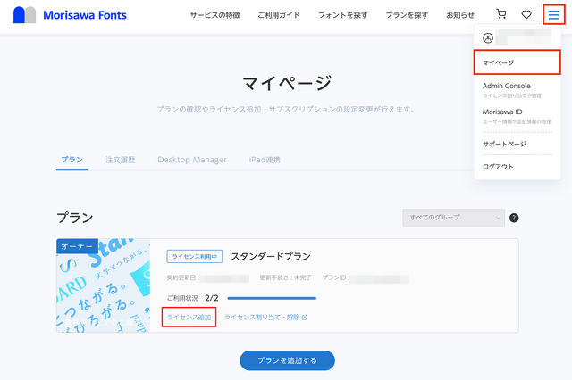 ログイン後、右上のメニューボタンをクリックしていただき、プルダウンメニューから「マイページ」→「プラン」→「ライセンス追加」へお進みください。