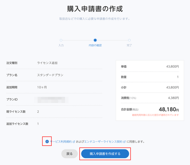 サービス利用規約およびエンドユーザーライセンス契約をご確認いただき、チェックボックスをクリックしてください。その後、「購入申請書を作成する」をクリックしてください。
