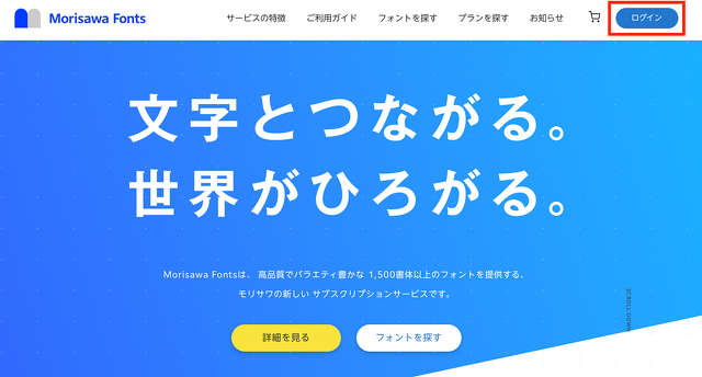 Morisawa Fontsサイトへアクセスし、右上のログインボタンをクリックしてください。