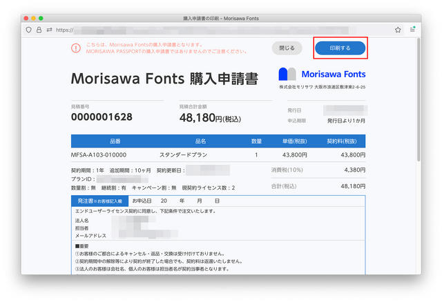 別ウインドウで「Morisawa Fonts 購入申請書」が開きますので、内容を最終確認していただき、問題がなければ「印刷する」をクリックし、PDF保存してください。