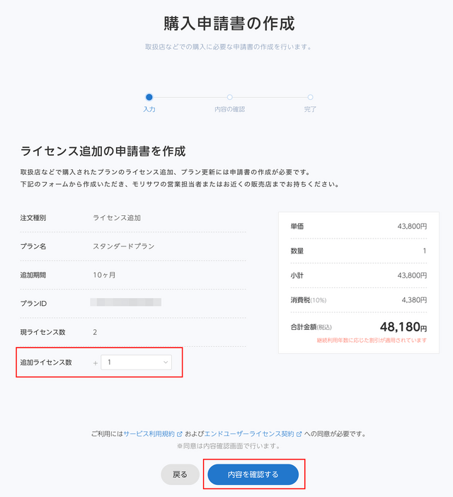 追加ライセンス数を選択のうえ「内容を確認する」をクリックしてください。