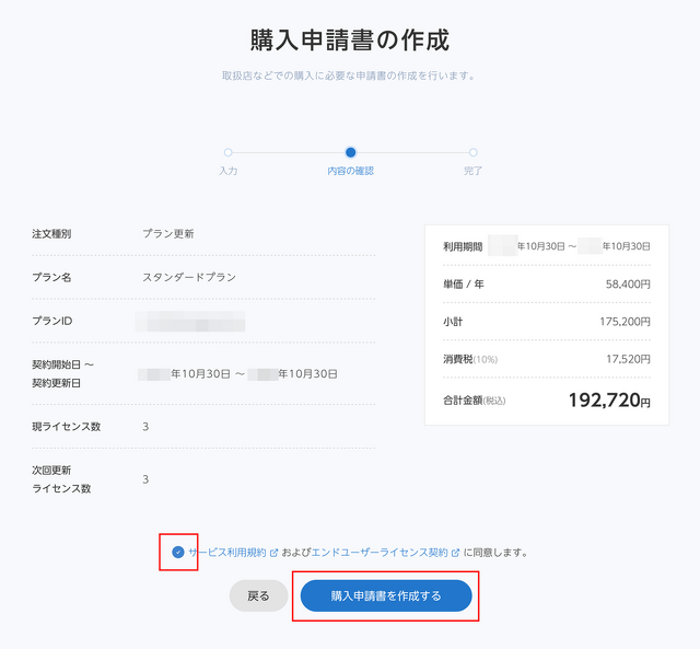 サービス利用規約およびエンドユーザーライセンス契約をご確認いただき、チェックボックスをクリックしてください。その後、「購入申請書を作成する」をクリックしてください。