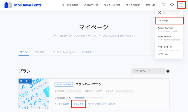 STEP 1:Morisawa Fontsにログインし、「プラン更新」