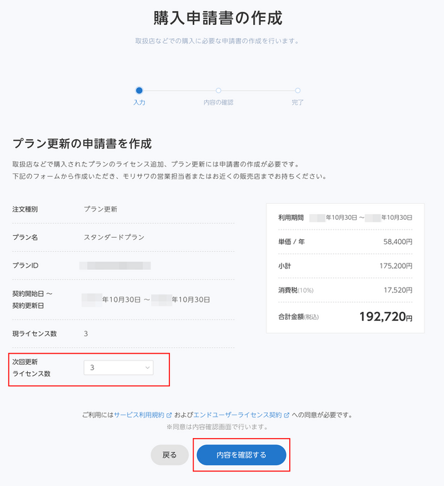 ご契約内容が表示されますのでご確認ください。ライセンス数に変更がある場合は変更のうえ、「内容を確認する」をクリックしてください。