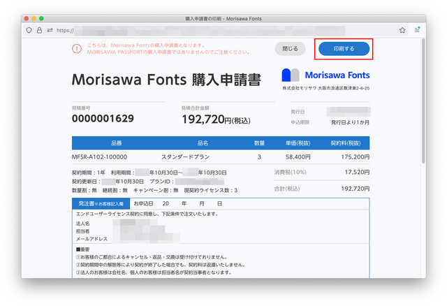 別ウインドウで「Morisawa Fonts 購入申請書」が開きますので、内容を最終確認していただき、問題がなければ「印刷する」をクリックし、PDF保存してください。