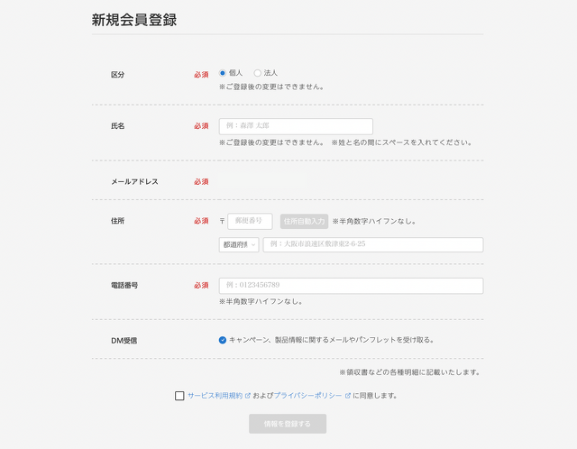 「新規会員登録」ページが表示されますので、各項目を入力し、「情報を登録する」をクリックしてください。