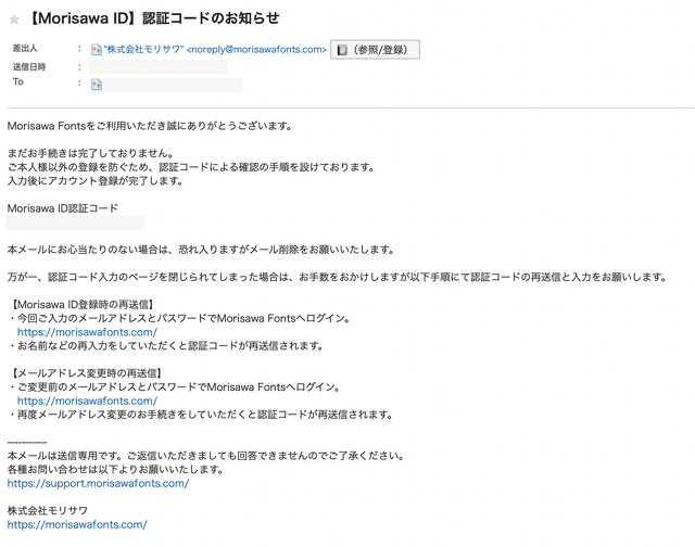 Morisawa IDのページに戻り、「認証コードのお知らせ」メールにある『認証コード』を入力して、「認証する」をクリックしてください。