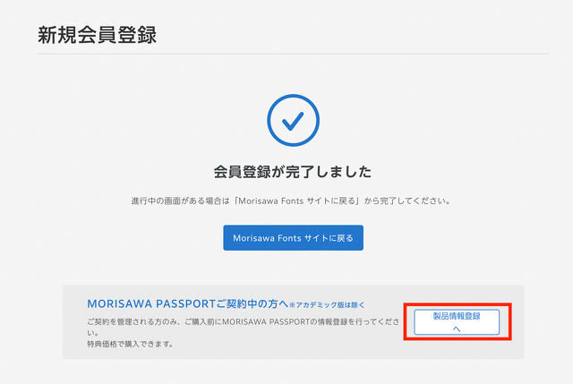 MORISAWA PASSPORTからの移行をご希望の際は、続いて、「製品情報登録」が必要となります。「製品情報登録へ」をクリックしてください。