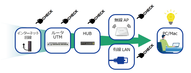 インターネット回線からMac/Winまでは、川のように様々な機器やLAN配線があることで成り立っています。