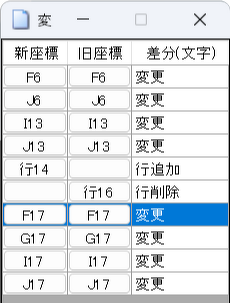行の追加やテキスト・値・計算式の変更などの差分を一覧表示します。差分をクリックすることで、変更箇所をフォーカスし、変更内容を確認できます。