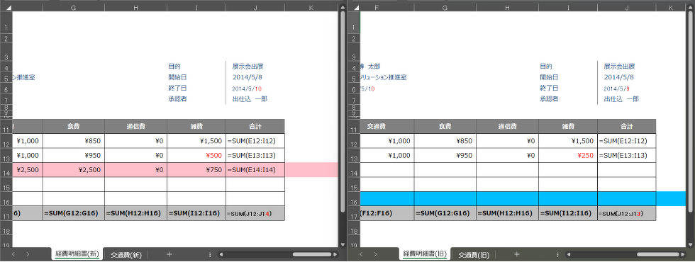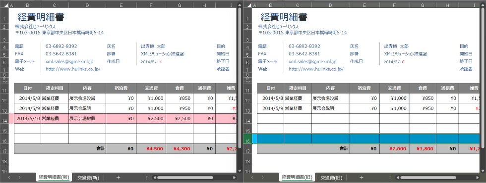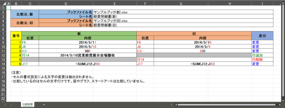 新旧のExcelを左右に並べ、追加・変更・削除を文字色や背景色でわかりやすく表示します。