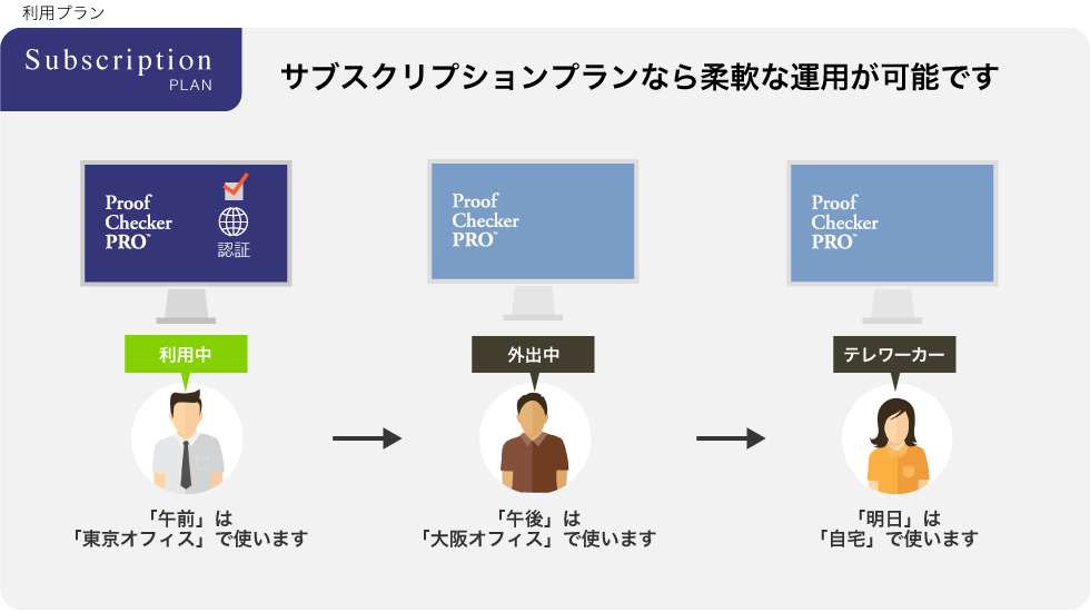 サブスクリプションプランなら、オンライン認証なので物理的なキーの移動がなく、同日で東京と大阪など異なる場所で利用するといった運用も可能です。
