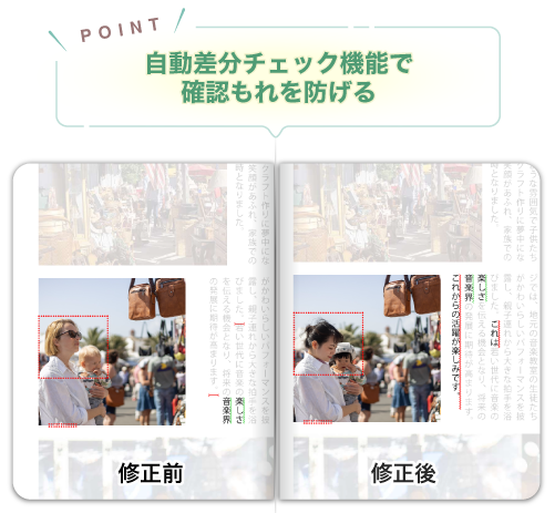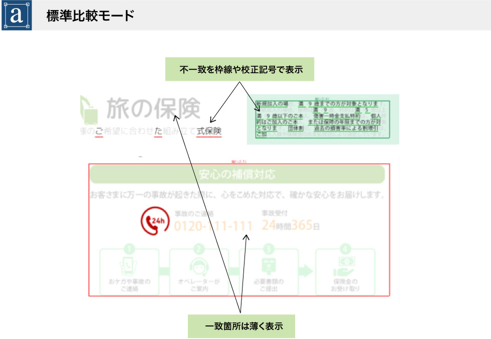 人の目では見落としがちな細かな部分もチェックできます。また、意図しない箇所が変更されていないことを担保できます。
