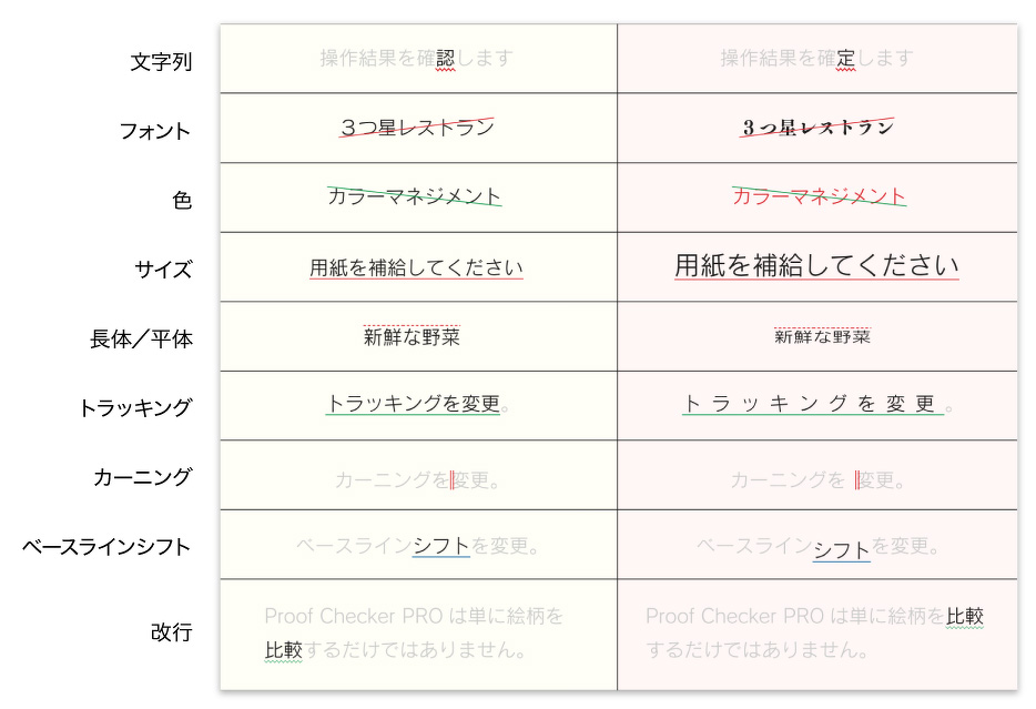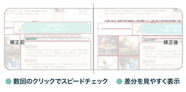 複雑にレイアウトされた書類のどの文字がどう変わったか等、正確なデータ照合が可能です。手間のかかる差分チェック作業を大幅に正確化・効率化する、画期的なデジタル校正ソフトウェアです。