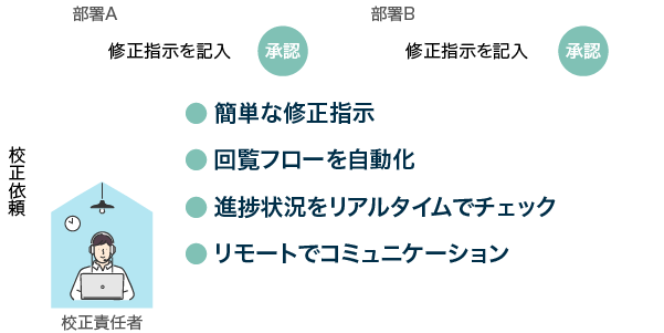 差分チェックや校正やり取りの手間が減り、あいた時間を他の業務に充てられます。テレワークなどの働き方にも対応できます。