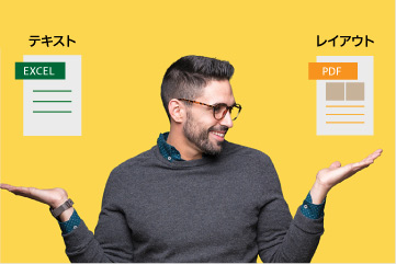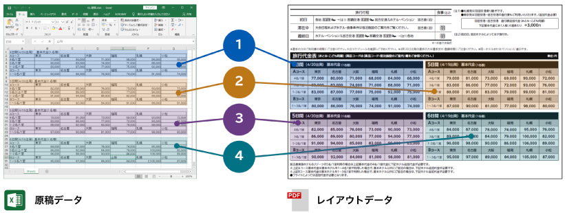 原稿が正しくレイアウトに反映されているかを、チェックできます。例えばレイアウトの異なるEXCELで作成された原稿とIllustrator(PDF)で作成されたレイアウトの比較が可能です。