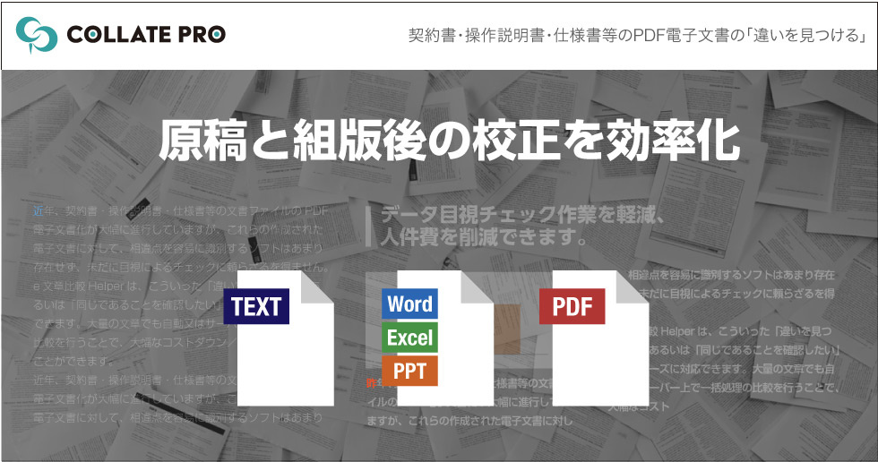 原稿とレイアウトデータの比較におすすめのツールです。原稿と組版の校正を効率化できます。契約書・操作説明書・仕様書等のPDF電子文書の「違いを見つける」、「同じであることを確認したい」というニーズに対応できます。