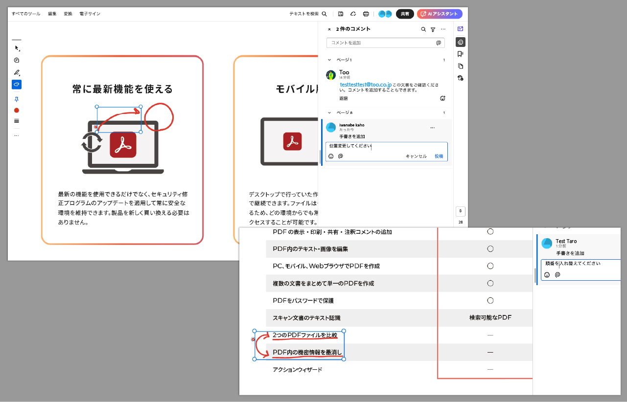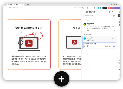 普段お使いのAcrobat ProからシームレスにPDFをアップロード、複数人でコメントを記入できます。デスクトップアプリ、モバイルアプリ、Webブラウザからもアクセス可能で、デバイスや場所に捉われずに作業できます。