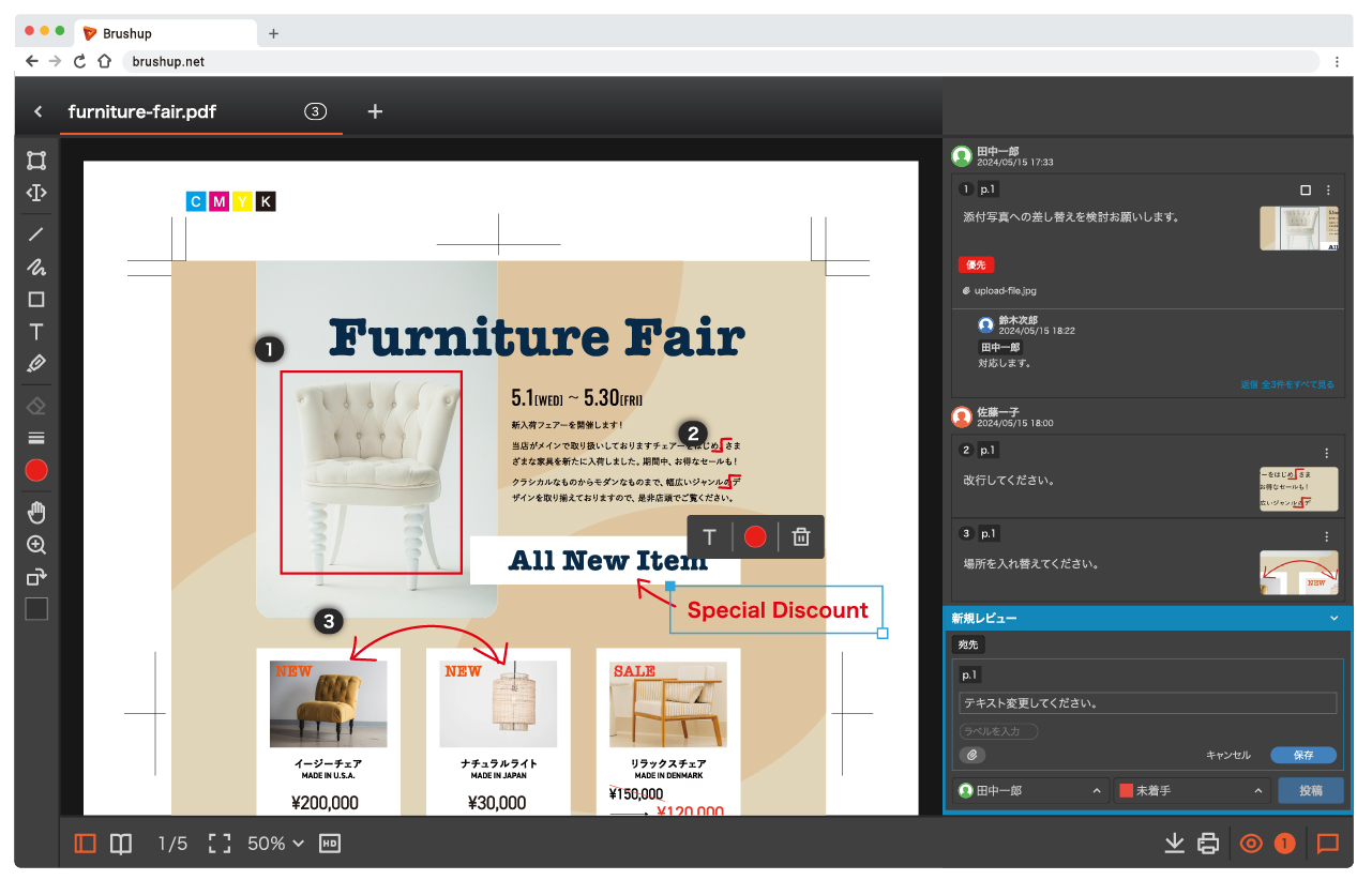 画像やテキストのコメントを入れたい場所をドラッグして、必要な指示を書き込めます。他のユーザーにメンションをつけて返信することもでき、修正箇所に関するやり取りをスレッドに集約できます。