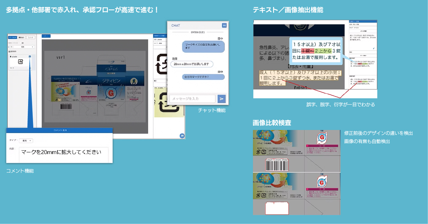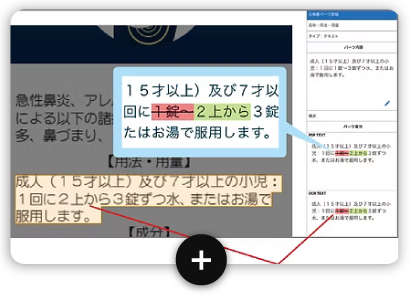 原稿情報とデザイン版下データの自動差分チェックが可能です。変更箇所が一目でわかります。