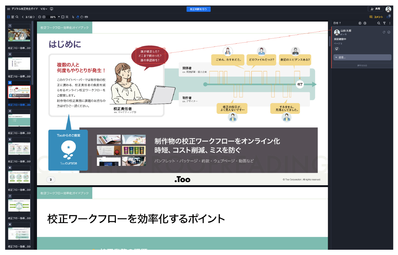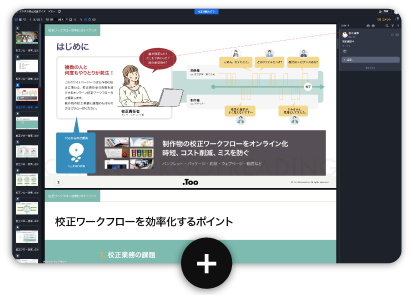 Webブラウザー上で、誰でも簡単に制作物へのコメントをすることが可能です。範囲を指定してコメントするだけでなく、テキストとして情報を選択したり、「トル」「ルビ」などのラベルを用いたスムーズな修正指示も可能です。(オプション)