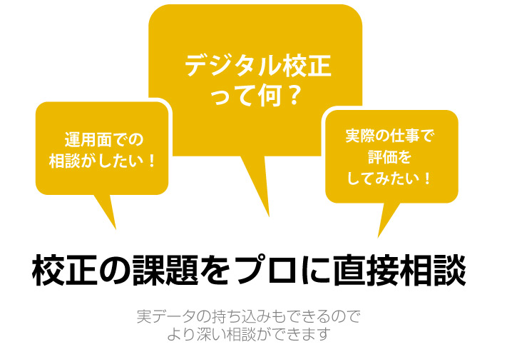 ひと括りに「校正」「検査」といっても、業界やメディア、目的によって、校正/検査ツールの選択が変わります。比較対象のファイル形式も違えば、文書と画像の比較、デジタルとアナログの比較など、求められる仕事が大きく異なります。「いつ」「なにを」比較したいかによって、最適なソフトウェアをご提案いたします。
