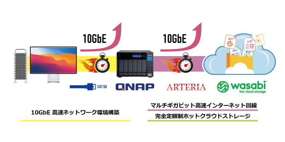 クラウドストレージとオフィスの10GbEネットワークに乗せたQNAP NASとの連携することで、データ制作環境の高速効率化と制作データ保全作業の効率化を両輪で可能にします。