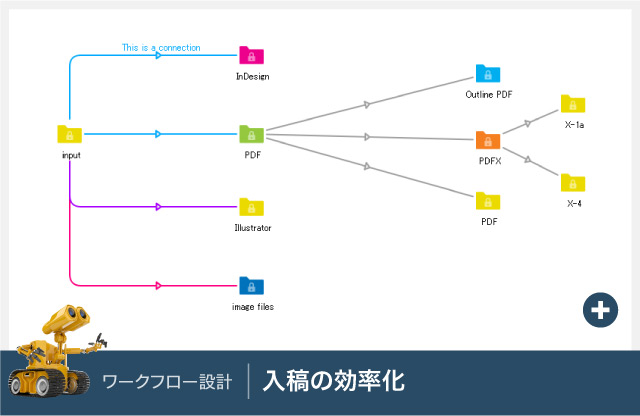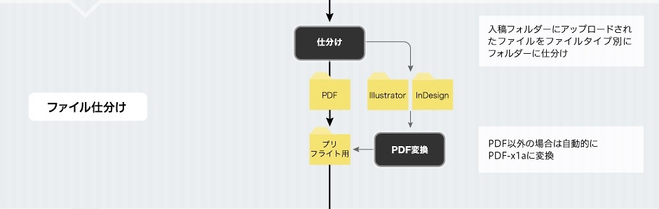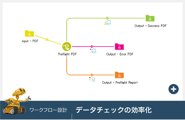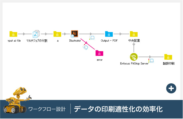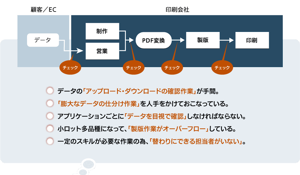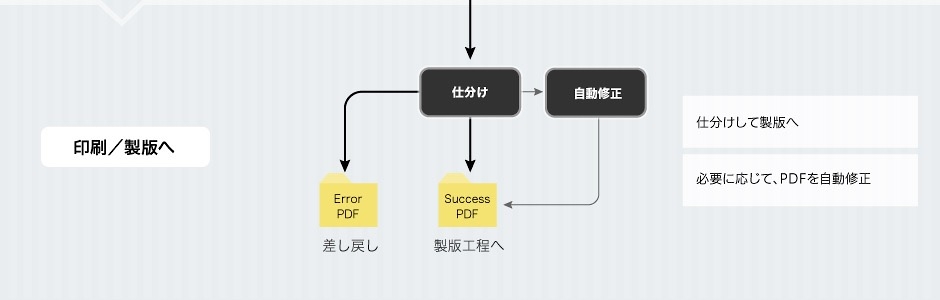 印刷ワークフローの課題の一つに入稿されたデータが印刷に適合していないことが挙げられます。また顧客やECから入稿されたデータを次のプロセスにまわす際にも人の手が必要です。