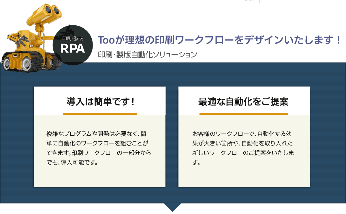 Tooの「印刷・DTP自動化ソリューション」は印刷ワークフローの各工程の手作業を自動化するRPAシステムです。お客様の課題をヒアリングし最適な解決策をご提案いたします。