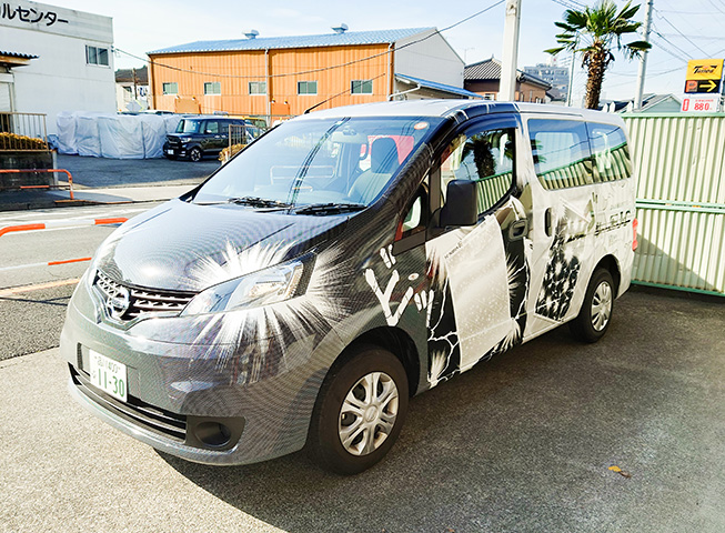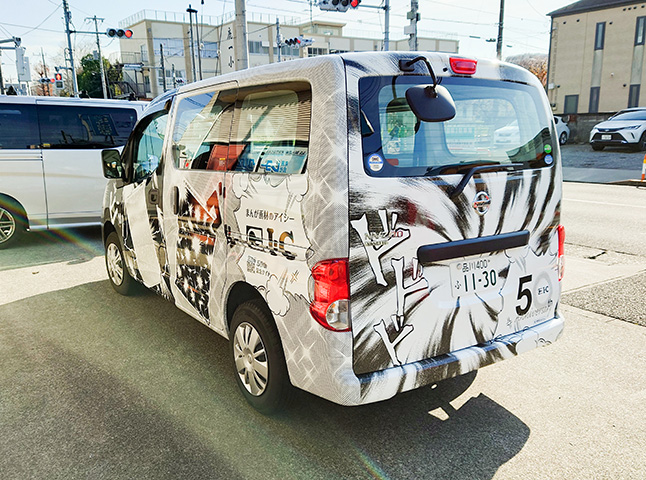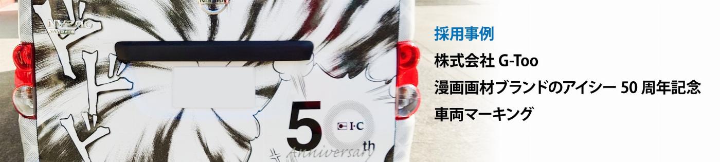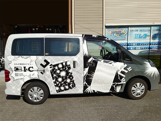 マンガ業界では有名なアイシーというブランド。漫画の原稿用紙や様々なスクリーンを取り揃えています。アイシーは株式会社G-Tooという株式会社Tooのグループ企業が運営しており、そのアイシーの50周年を記念して社用車を、漫画で利用するアイシースクリーン調のデザインでフルラップしました。モノクロの大胆なデザイン、まるでマンガ誌のような大迫力を実現しました。
