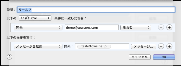 上記は、メールアドレス「demo@towsnet.com」宛のメールを、「test@tows.ne.jp」宛に転送する際の設定例です。設定入力後、「OK」をクリックします。