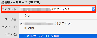 送信用メールサーバ(SMTP) の「アカウント」の部分をクリック、