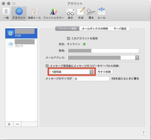 「アカウント情報」タブ、「メッセージ受信後にメッセージのコピーをサーバから削除」チェックありの状態で、