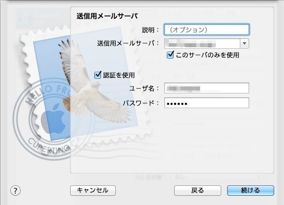 [ 送信用メールサーバ ] ウィンドウが表示されます。以下のように設定し、[ 続ける ]をクリックします。