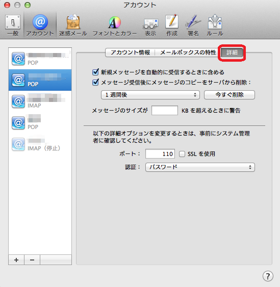(削除しない設定にしますと、サーバ上にメールが溜まりつづけ、やがていっぱいになり受信できなくなります。)