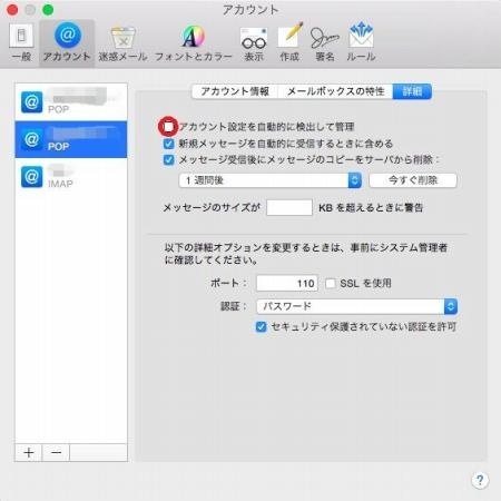 (削除しない設定にしますと、サーバ上にメールが溜まりつづけ、やがていっぱいになり受信できなくなります。)