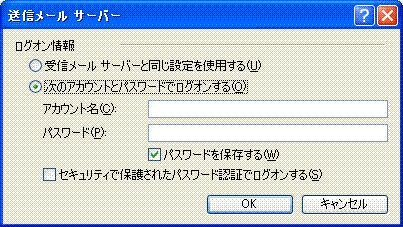 送信メールサーバーウィンドウ、「次のアカウントとパスワードでログオンする」を選択し、送信用アカウント名と送信用パスワードを入力、「パスワードを保存する」にチェックを入れ、「OK」ボタンを押します。