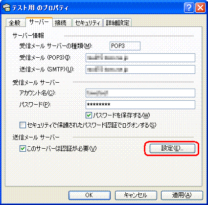 アカウントのプロパティ、「サーバー」タブにて、送信メールサーバーの「このサーバーは認証が必要」にチェックを入れ、右の「設定」ボタンを押します。