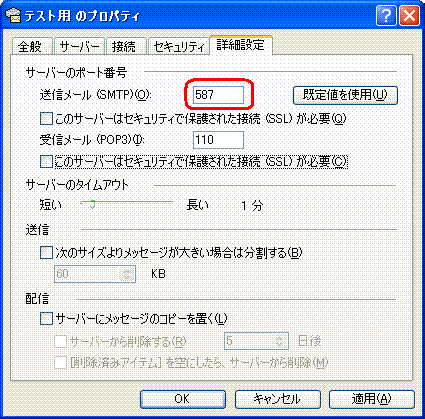 さらに「詳細設定」タブにて、サーバーのポート番号の項目、送信メール(SMTP)の番号を「587」と入力します。
