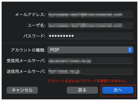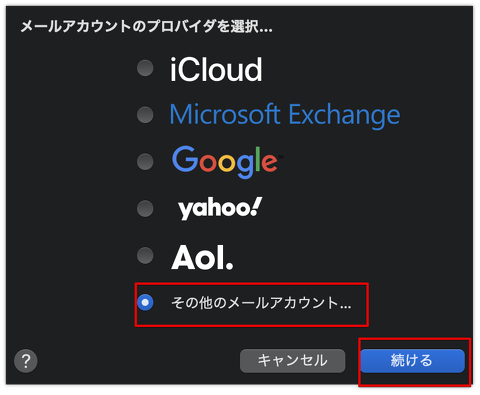 ※バージョンによっては、この後もパスワード確認画面が出ることがあります。 アカウントは既に登録されておりますので、「キャンセル」をクリックしてください。