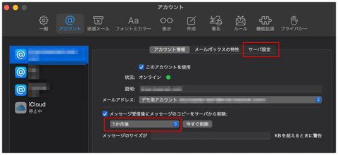 追加完了したアカウントの、「メッセージ受信後にメッセージのコピーをサーバから削除」の項にチェックが入っており、