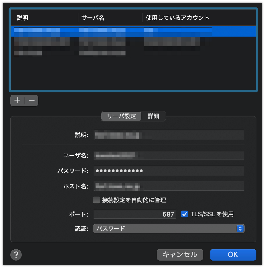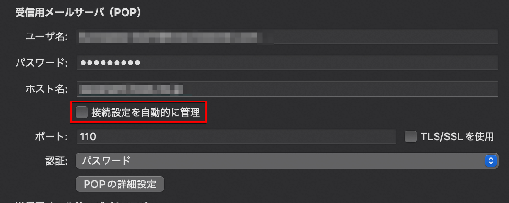 ・TLS/SSL を使用: チェックなし。